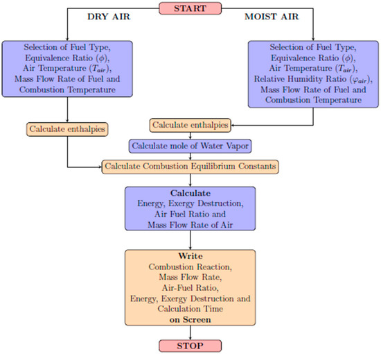 Figure 3 depicts a flow diagram illustrating the process of conducting energy and exergy analyses for both dry and moist air. The user is required to make several selections and input various parameters. These include choosing the fuel type, specifying the equivalence ratio (ϕ), providing the air temperature (), indicating the relative humidity ratio of the air (), and, if moist air is being used, entering the mass flow rate of fuel and the combustion temperature. In the case of moist air, additional steps are taken. Tables are consulted to determine the mole number of water vapor, which is then calculated. Subsequently, the combustion equilibrium constants are computed, followed by the determination of the energy, exergy destruction, air–fuel ratio, and mass flow rate of air. Finally, the obtained results are displayed on the screen.