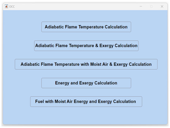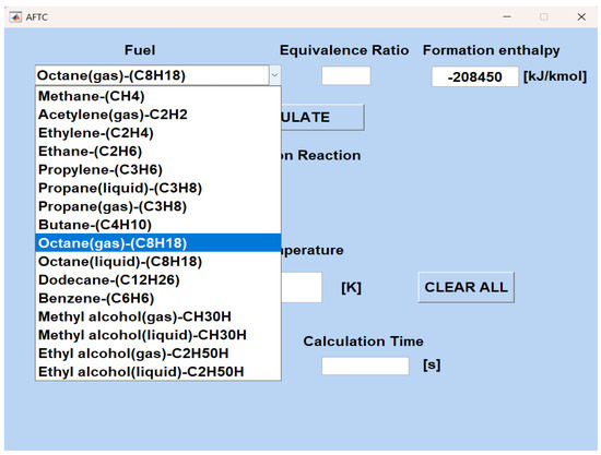 The primary interface of the OCC program empowers users to select one of five problems through its main screen. Figure 4 visually presents this main screen, where users can conveniently choose their desired problem to calculate. The selection of fuels is made by using the predefined list of fuels. In addition to fuel selection, users are prompted to input various parameters, including the equivalence ratio (ϕ), air temperature (), relative humidity ratio of the air (), mass flow rate of fuel, and combustion temperature. Figure 5 showcases the comprehensive list of fuels available in the AFT calculation program.