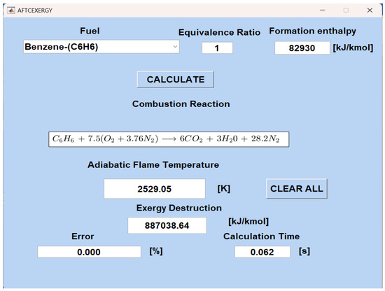 Figure 7 shows the AFT result and exergy analysis of benzene (C6H6) combustion with an equivalence ratio of ϕ = 1 (Adiabatic Flame Temperature and Exergy Calculation Module).