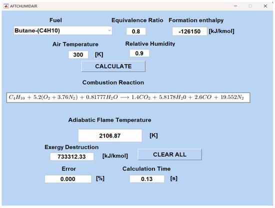 The AFT result and exergy analysis of butane (C4H10) combustion with an equivalence ratio of ϕ = 0.8 at 300 K and is presented in Figure 8 (Adiabatic Flame Temperature of Combustion With Moist Air and Exergy Calculation Module).