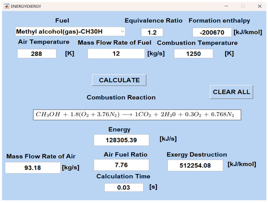 In Figure 9, energy and exergy analyses of methyl alcohol (CH3OH) combustion with an equivalence ratio of ϕ = 1.2 at 288 K, fuel mass flow rate of 12 kg/s, and combustion temperature of 1250 K are presented (Energy and Exergy Module).