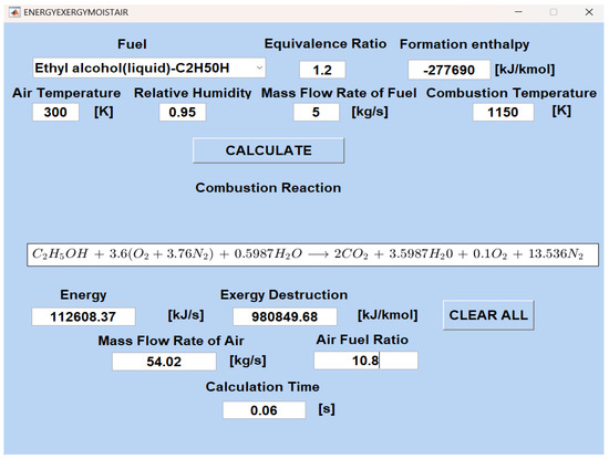 The software was validated by calculating the adiabatic flame temperature of liquid octane (C8H18 (liquid)) combustion for stoichiometric combustion (ϕ = 1), rich combustion (ϕ > 1), and excess air combustion (ϕ < 1). The stoichiometric combustion (ϕ = 1) of liquid ethanol (C2H5OH (liquid)) was compared with experimental data [35]. The validation results are presented in Table 1.
