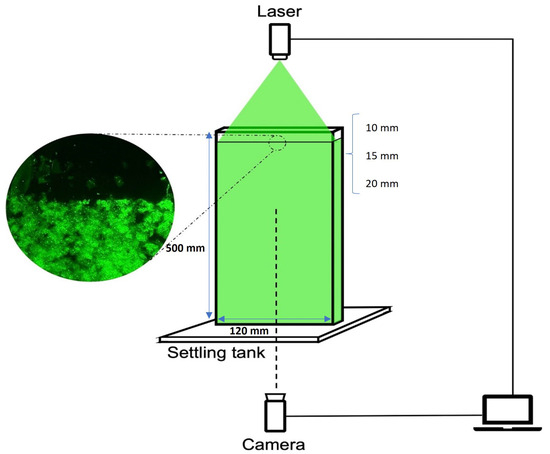 The sedimentation behavior of montmorillonite flocs between flat plates in a 2D system was explored using Particle Image Velocimetry (PIV) analysis. For this purpose, the experimental apparatus consisted of a rectangular container. A laser sheet, specifically, a Nd:YAG laser (LA-D40-CW from Omicron, Erlangen, Germany) illuminated the flocculated sedimentation of the montmorillonite suspension within each container, thereby facilitating a 2D system analysis. The experiment utilized a mixture of water, montmorillonite gel, and sodium chloride solution. Section 2.1 details the experimental setup and materials, and Section 2.2 delves into the image analysis, encompassing PIV; PTV; observation of the interface height; and Fourier transformation, as applied to the settling behavior of montmorillonite flocs.