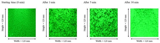 where h(t) and Δt represent the interface height at time t and the time step, respectively. Furthermore, Fourier analysis was performed to investigate the growth of the flocs over time following image processing. The montmorillonite flocs experience growth through sedimentation and consolidation, which results in increased illumination. By taking this phenomenon into account, it was possible to quantify the growth of the flocs over time by analyzing the illumination intensity in the images using Fourier analysis. In this analysis, the Fourier transform was applied to calculate the spectrum and to quantitatively measure the floc size at the dominant wave number. The relationship between the wavelength (floc size in 2D), L (cm), and the wave number, f (cm−1), is provided by Equation (3).
