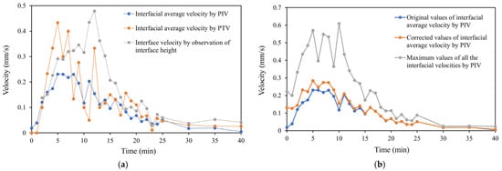 Time variation in interfacial average velocity calculated with PIV: (a) comparison of interfacial average velocity calculated with PIV and PTV and interface velocity based on observation of the interface height; (b) comparison of original and corrected values of the interfacial average velocity and maximum values of all the interfacial velocities, calculated with PIV.