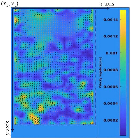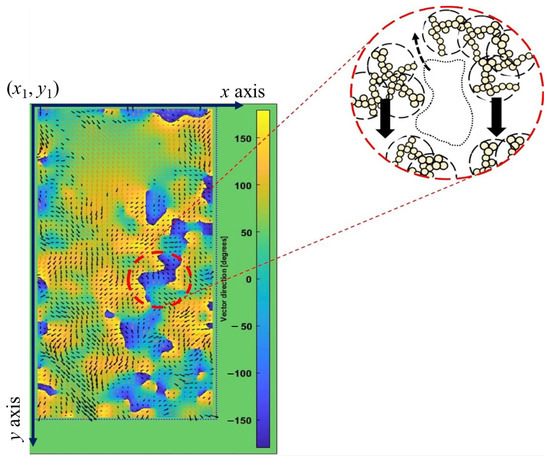 Figure 6 and Figure 7 illustrate the distribution of velocity vectors and the direction of these vectors along a horizontal line, respectively, during the sedimentation of flocculated Na-montmorillonite in a rectangular settling container with a 20 mm thickness. In Figure 7, positive degrees indicate downward flow, while negative degrees indicate upward flow. The vector maps revealed that the presence of turbulence resulted in a variety of effective velocity values, demonstrating that the flocs and the surrounding fluid move at different velocities. Additionally, they showed flow instability, with larger flocs descending and smaller flocs, along with the fluid, ascending. This is indicative of the feed-forward mechanism occurring during the sedimentation process.