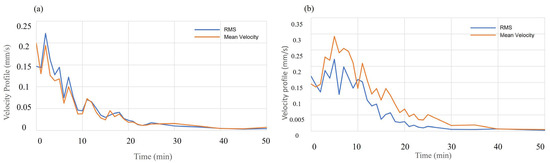 The sedimentation turbulence was quantified for the sedimentation of flocculated Na-montmorillonite in a rectangular settling container with a 20 mm thickness. The analysis focused on the first two stages of the semi-dilute regime (i.e., flocculation and sedimentation), where flow instability begins to emerge and intensifies during the floc collapse. This instability or turbulence during the sedimentation of flocculated material results in fluctuations in velocity [24,25]. Therefore, to investigate the time variation in sedimentation turbulence, the interfacial average velocity and the root-mean-square (RMS) velocity [26] were obtained using the following equations: