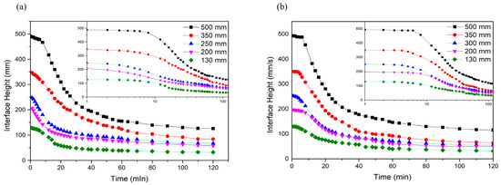 Time variation in the interface height as a function of initial suspension height for the sedimentation of flocculated Na-montmorillonite in rectangular settling containers with different thicknesses: (a) 20 mm; (b) 15 mm.