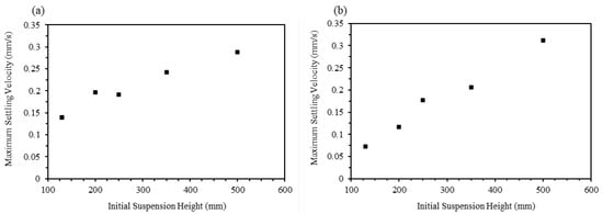 Maximum velocity of the moving interface height with respect to different initial suspension heights for the sedimentation of flocculated Na-montmorillonite in rectangular settling containers with different thicknesses: (a) 20 mm; (b) 15 mm.