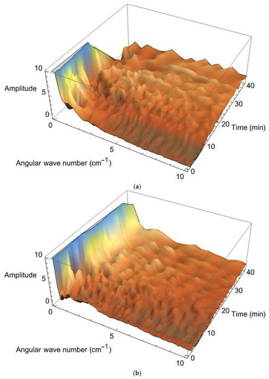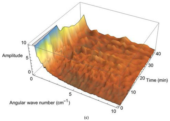 Fourier analysis was applied in the vertical direction for rectangular containers with thicknesses of 10 mm, 15 mm, and 20 mm. The temporal evolution of the vertical component of the Fourier spectrum in containers with different thicknesses is presented in Figure 12. These figures illustrate the temporal changes in the spectral distribution, where the spectral distribution itself represents the frequency (amplitude) of flocs of various sizes (wave numbers). Thus, by examining Figure 12, we can visually understand the temporal changes in the size distribution of flocs during sedimentation. In cases (a), 10 mm, and (b), 15 mm, we observed temporal changes in the spectral distribution corresponding to the flocculation stage, sedimentation stage, and consolidation stage. However, in case (c), 20 mm, it was not possible to clearly observe temporal changes in the spectral distribution. This may be because the laser is emitted in a sheet-like form, and as the thickness increases, flocs not directly illuminated exist, affecting the brightness. This remains a future challenge for flock size estimation using Fourier analysis. The beginning of the sedimentation stage in case (a), 10 mm, is around 10 min, whereas in case (b), 15 mm, it is around 5 min, a trend that is consistent with Figure 11. In the flocculation stage, from approximately 0 to 10 min in case (a) and 0 to 5 min in case (b), the montmorillonite flocs appear to be uniformly distributed, resulting in a small amplitude across all wave numbers. In the settling stage, from approximately 10 to 20 min in case (a) and 5 to 20 min in case (b), there is a significant variation in amplitude. During this stage, the grown flocs undergo separation and additional flocculation because of collisions, further promoting floc growth. The sedimentation of different-sized flocs causes a large amplitude across all wave numbers. In the consolidation stage, from approximately 20 to 40 min in cases (a) and (b), compaction commences from the flocs that have settled at the bottom, and the compaction process progresses very slowly because of the weight of the flocs. As a result, the floc size gradually decreases until stabilization occurs, leading to a gradual decrease in amplitude, eventually stabilizing into a specific amplitude pattern.