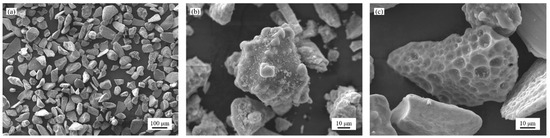 A scanning electron microscope (SEM, ZEISS ASIN EVO10, Carl Zeiss AG, Jena, Germany) equipped with an energy dispersive spectrometer (EDS, X-Max 80, Oxford Instruments, Abingdon, UK) was used to observe the microscopic morphology. The scanning electron microscope was analysed using a tungsten filament at an accelerating voltage of 0.2–30 kV, a pressure of less than 400 Pa, and a probe current continuously adjustable in the range of 0.5 PA–5 μA. As shown in Figure 2a, the local magnification reveals that it consists of two types of particles. Based on the EDS results, it was found that the first type of powder has bright white ferrosilicon particles attached to the surface, as shown in Figure 2b. The other type of powder particles have a mixture of Si and SiO2 on the surface, with pits of different sizes as shown in Figure 2c, and there are pits of different sizes, which are caused by the erosion by copper during the preparation of organosilicon monomers using the Rochow–Müller process [15].