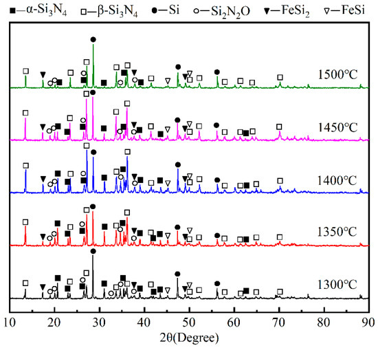 Phases formed after nitriding for 3 h at various temperatures are indicated in the XRD diffractograms in Figure 6. The products indicate various combinations of Si, FeSi2, FeSi, α-Si3N4, β-Si3N4, and Si2N2O, depending on the treatment temperature. The resulting nitriding products are due to the reaction of N2 reaction gas with O in the raw materials at high temperatures, producing different Si3N4 and Si2N2O phases [21]. At the same time, comparing Figure 5 and Figure 6, it can be found that the peak ratio of Si and nitride products is consistent with the change rule of the TG curve.