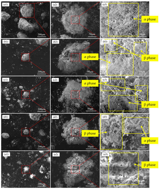 Micromorphologies of nitriding products of silicon dust at different temperatures for 3 h (a1–a3) 1300 °C; (b1–b3) 1350 °C; (c1–c3) 1400 °C; (d1–d3) 1450 °C; (e1–e3) 1500 °C.