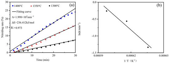 In order to obtain the kinetic parameters of the nitriding process, isothermal nitriding experiments were carried out at 1300~1500 °C, and the kinetic equation can be written as Equation (11).