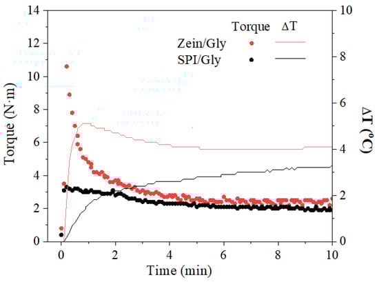 Temperature increase and torque profiles during the Zein/Gly and SPI/Gly mixing stage.