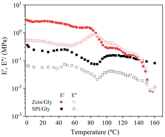 Figure 3 shows the storage and loss modulus (E′ and E″) obtained for Zein/Gly and SPI/Gly blends as a function of temperature. These results indicate that heating the blends causes a decrease in their viscoelastic moduli which can be attributed to the increases in the biopolymer mobility and consequently increases the capacity of materials to deform [,]. Moreover, the biopolymer mobility is highly dependent on the plasticizer content since a lubricating effect is associated with this additive []. This effect is also observed in Figure 3 since the values obtained for the viscoelastic moduli of SPI/Gly blend were lower than those obtained by Zein/Gly blend (E′ = 0.201 ± 0.017 and 2.63 ± 0.12 for SPI/Gly and Zein/Gly blends, respectively), which agrees with the much higher Gly content of SPI/Gly systems (i.e., 40% Gly for SPI blend, 25% Gly for Zein blend).