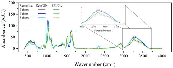 FT-IR diffractograms for Zein/Gly and SPI/Gly recycled bioplastics (0, 1, and 5 times).