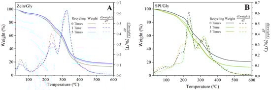 Thermal gravimetric analysis (TGA) tests for Zein/Gly (A) and SPI/Gly (B) recycled bioplastics (0, 1, and 5 times).