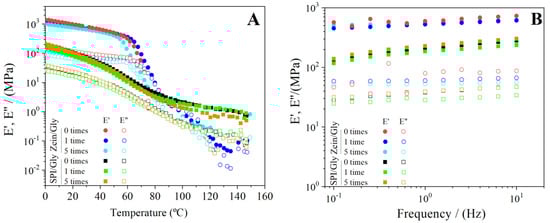 Evolution of viscoelastic moduli (E′ and E″) with temperature (A) and frequency (B) for Zein/Gly and SPI/Gly recycled bioplastics (0, 1, and 5 times).