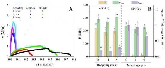 Stress–strain curves for one representative sample (A) and parameters obtained from tensile tests (E, , and ) of five significant replicates (B) for Zein/Gly and SPI/Gly recycled bioplastics (0, 1, and 5 times). Different letters (Lowercase, uppercase and greek letter for Young’s modulus, maximum stress and strain at break, respectively) within a column indicate significant differences (p < 0.05).