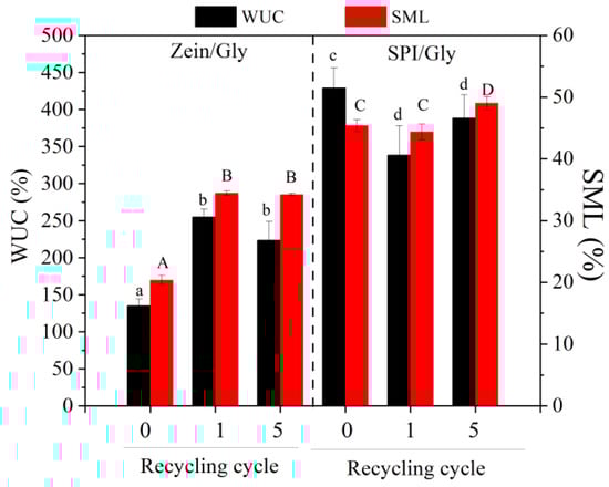 Water uptake capacity (WUC) and soluble matter loss (SML) for Zein/Gly and SPI/Gly recycled bioplastics (0, 1, and 5 times). Different letters (Lowercase and uppercase for WUC and SML, respectively) within a column indicate significant differences (p < 0.05).
