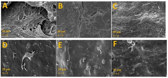 Figure 9 shows SEM images (A, B, and C for Zein/Gly and D, E, and F for SPI/Gly) of Zein/Gly and SPI/Gly bioplastics recycled zero, one, and five times after 24 h of water absorption and further freeze drying, thus obtaining the resulting microstructure. This microstructure can reveal changes in the functional properties as a result of the reprocessing cycles. These micrographs show that the bio-based materials developed a porous structure after 24 h of water immersion (more evident for Zein-based materials), which enabled water penetration and further absorption. The porous structure initially observed for Zein-based materials at zero recycling cycles was almost lost after the first recycling cycle, confirming the importance that reprocessing had on the structure of these bioplastics. So, after the first sample reprocessing, the water molecules seem to be held within the biopolymer network, a mechanism that was also observed for SPI-based bioplastics. However, the SPI/Gly surface was smoother and more consistent, but the number of holes increased for this biopolymer as it was reprocessed, which may have caused the above-mentioned reduction in the σMax of the material.