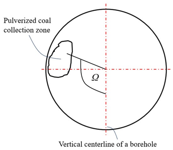 Based on practical experience in underground coalmines, the degree of particle deposition provides an effective measure for evaluating the effect of coal dust discharge. It is noteworthy that suspended coal dust is more easily discharged from the borehole than the coal dust that settles at the bottom. To measure coal dust deposition, as illustrated in Figure 2, the center of the coal dust collection zone in relation to a particular particle size is linked with the center of the borehole. The angle that is created by the line and the vertical midline of the borehole (in a downward direction) constitutes the angle of deflection of the coal dust collection zone, labeled as Ω. The larger deflection angle of the collection zone indicates that the coal dust is less deposited and more suspended, which makes it easier to be discharged out of the borehole.