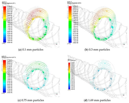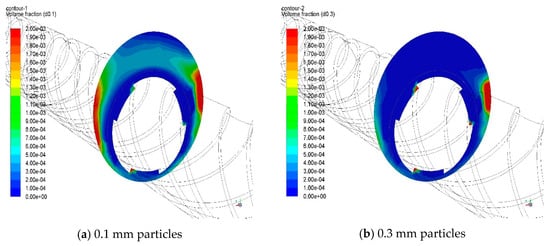 Taking case 24 (speed: 120 rpm, airflow: 500 m3/h, volume fraction: 0.10%) as an example, in the Figure 4, Figure 5 and Figure 6, it can be seen that the coal dust particles (especially the large particles) can easily reach the other side from the bottom by following the threads, duo to the rotational speed being much lower than the wind speed. So, there will be a situation where the left side of the downstream will have a higher content of coal dust.