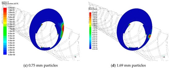 After the particle deposition under different cases was analyzed, it was found that the trend of volume distribution of different particles was similar, with 0.1 mm particles mainly distributed in the middle and upper sides, 0.3 mm and 0.75 mm particles distributed in the middle and lower sides, and 1.69 mm particles distributed more at the bottom.