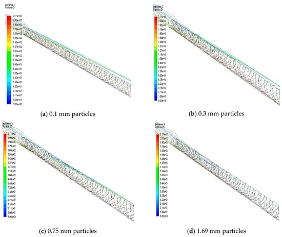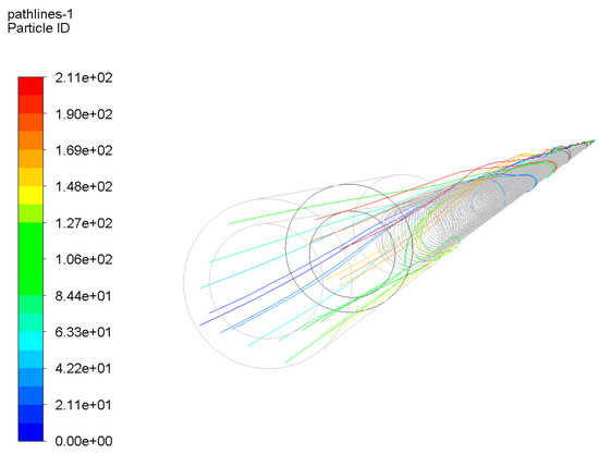 In Figure 13, the trajectory of 0.1 mm coal dust is depicted with an air volume of 300 m3/h and a rotational speed of 0. The various colors of lines in the figure signify the trajectory of coal dust with different particle sizes. As the figure illustrates, in the absence of drill rod rotation, coal dust is suspended in a stabilized state and transported along a particular trajectory line to the porthole. This stable suspension of coal dust is maintained by the aerodynamic forces that are presented in the airflow rate, which carries the mixture of coal and air to the porthole.
