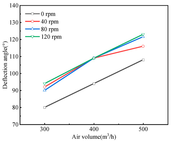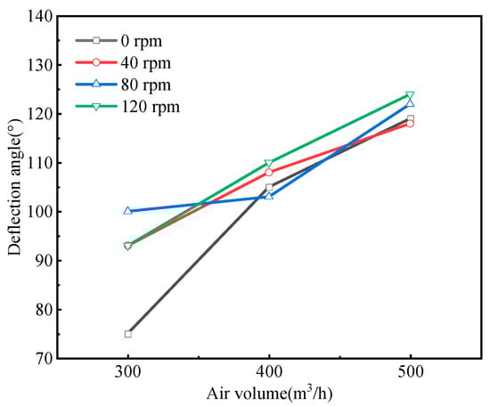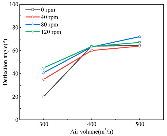 As illustrated in Figure 9 and Figure 10, for coal dust with a diameter of 1.69 mm, the deflection angle within the coal dust collection zone amplifies with an increase in airflow. With an air volume of 300 m3/h, elevating the rotational speed results in a substantial enhancement of the deflection angle. Specifically, the deflection angle rises from 20° during stationary drill rod to 46° at 120 rpm, exhibiting a 130% augmentation. However, the influence of raising the rotational speed on the deflection angle becomes obscure when the airflow setting is at 400 m3/h. Under an airflow of 500 m3/h, the deflection angle of the coal dust collection zone rises from 61° during non-rotation of the drill rod to 70° at 120 rpm, representing a 12.8% surge.
