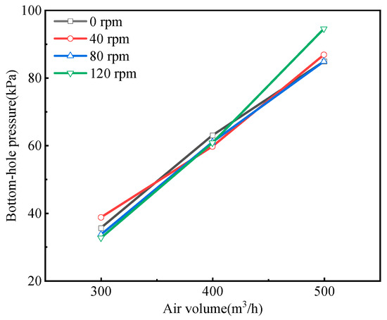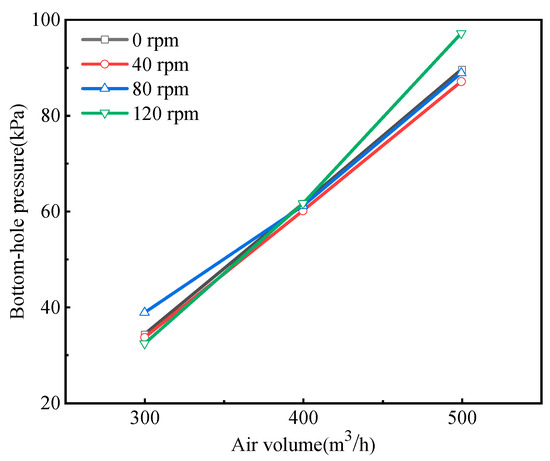 From the figure presented, it is evident that the pressure at the bottom of the borehole increases as the air volume escalates. However, when the air volume reaches 300 m3/h and 400 m3/h, changes in the rotational speed do not exhibit a significant impact on the bottom-hole pressure. In the case of an air volume of 500 m3/h, there is no apparent difference in the pressure between rotational speeds of 0, 40, and 80 rpm. However, with a rotational speed of 120 rpm, there is a notable increase in the bottom-hole pressure by 10 kPa.