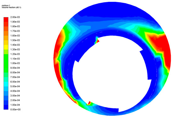 While small particles tend to disperse throughout different regions, this section primarily focuses on the deposition behavior of large particles. By analyzing the volume fraction of large particles with a diameter of 1.69 mm under various operating conditions, it can be observed that when the airflow is set at 500 m3/h, the rotational speed requires 80 rpm or above to prevent particle deposition. Similarly, for an airflow of 400 m3/h, a rotational speed of 120 rpm or higher is required to avoid particle deposition. As for an airflow of 300 m3/h, even when the rotational speed reaches 120 rpm, there is still a small amount of deposition presenting at the bottom.
