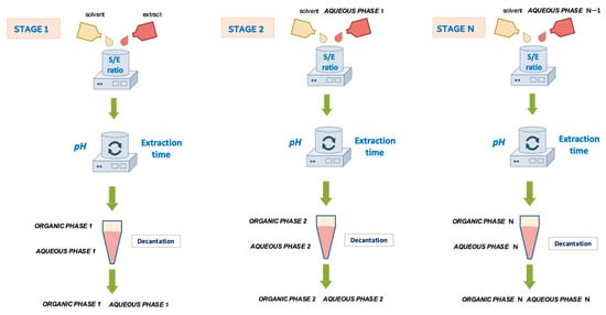 Therefore, a total of 27 experiments were required to elucidate the operation and to predict the outputs. These experiments were conducted following a similar procedure to the previous extraction tests, but in this case, varying the extraction times, number of extraction stages, solvent/extract ratio, and pH (Figure 2). The latter variable is particularly important because the concentrations of polyphenols and sugars vary depending on pH [21].