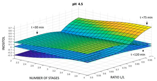 The response surface obtained at pH 4 was similar to that obtained at pH 4.5 (see Figure S2). A higher inositol concentration (1057 mg/L) was achieved by conducting four extraction stages of 75 min at a ratio of 1. Moreover, extraction for 30 min increased the inositol concentration by up to 20%, while extraction for 120 min reduced it. At pH 3.5, the most enriched inositol extract was achieved by performing extractions for 30 min, either with more than three stages and ratios higher than 0.75 (up to 962 mg/L), or with less than three stages and ratios lower than 0.5 (up to 823 mg/L) (Table 7). Performing longer extractions was not effective, as the inositol concentration remained virtually constant with respect to that obtained in the hydrothermal treatment (Figure S2).