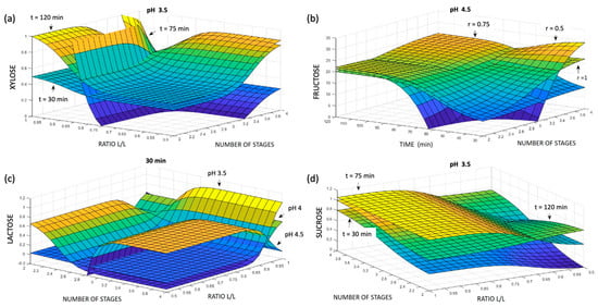 Similar to xylose, lactose was not detected in the extract resulting from the hydrothermal treatment (Table 4). Lactose is a dimer resulting from the union of glucose and galactose molecules, and hydrothermal treatment may not be suitable for its formation [27]. However, the L/L extraction process probably facilitated their bonding, leading to the formation of lactose molecules during this process. This may explain why lactose was not detected in the extract of some experiments (Table S3). Figure 5c shows the effect of the number of stages, solvent/extract ratio, and pH on the lactose concentration for 30 min extractions determined with the neuro-fuzzy model. In this case, the resulting response surfaces were very similar to each other (Figure S6). This indicates that the lactose concentration remained almost constant for extraction times of 30, 75, and 120 min. At pH 4.5, a higher lactose content was achieved by performing three to four stages with a ratio ranging from 0.5 to 0.75, regardless of the extraction time. At pH 3.5, a higher lactose concentration was obtained by conducting more than three stages using ratios lower than 0.8. Thus, the optimal conditions included performing four extraction stages for 30 min with a solvent/extract ratio of 1.