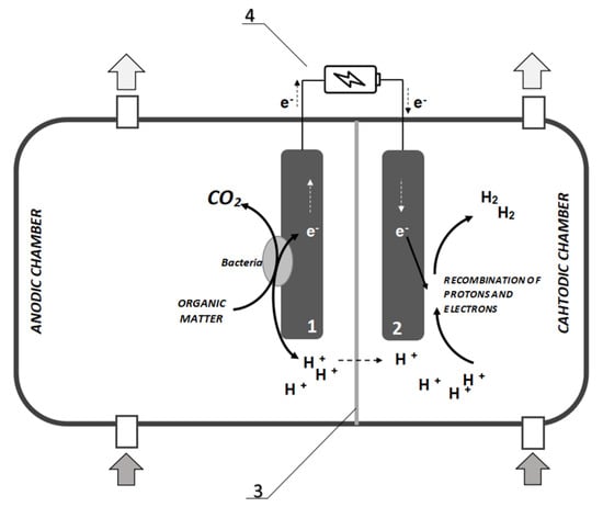 Schematic representation of the working principles of a microbial electrolysis cell. 1—anode; 2—cathode; 3—proton exchange membrane; 4—external electric power source.