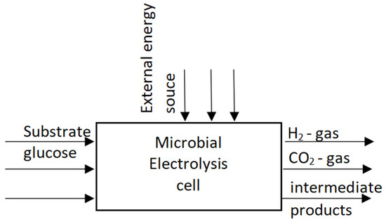 The energy assessment of the microbial electrolysis cell in this study relies on the literature data concerning process dynamics and kinetics [23,24]. Selembo et al., 2009, investigated the use of two different substrates—glucose and glycerol—at a concentration of 1 g/L, applying two external voltages (0.5 V and 0.9 V) for the electrolysis process. They reported that the utilization of each mole of glucose as a substrate results in the cathodic production of 6.4 to 7.2 moles of H2, depending on the voltage applied. When using glycerol, the yield was 3.1 to 3.9 moles of H2 per mole of glycerol under the same electrochemical conditions.