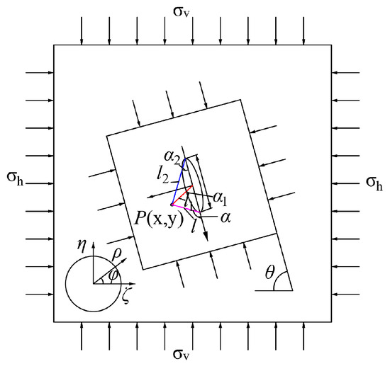 According to a study by Wang et al. [51], it is believed that the tectonic stress of a fault is influenced by the fault length, fault dip angle, mining disturbance, and ground stress. The dip profile of the F16 fault in the Gengcun Mine is regarded as an elliptical formation fracture, and a complex coordinate system z = x + iy is established by combining the fault angle (θ) and the center of the ellipse (see Figure 2). The infinite region outside the crack is transformed into a polar circle of the coordinate system () through the conformal transformation of the complex potential function [51,52]. In Figure 2, is the length of the point at the edge of the ellipse hole and the line at the center of the ellipse, m; is the angle between the line of the edge point of the ellipse hole and the center of the ellipse, and the major axis of the ellipse (°). and form the polar coordinate system.