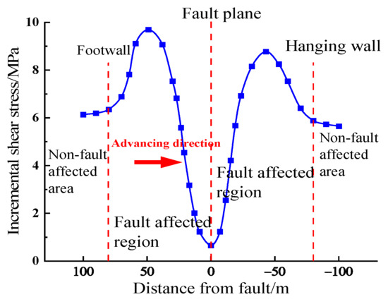 Figure 3 shows that the distribution range of the shear stress increment in the footwall of the fault is larger than that in the hanging wall, exhibiting an asymmetric distribution. The maximum shear stress increment in the footwall is 9.69 MPa, and the maximum value is located 49 m away from the fault plane. The maximum increment in shear stress in the hanging wall is 8.78 MPa, and the maximum value is located 43 m away from the fault plane. The shear stress increment in the hanging wall is less than that in the footwall, the main reason being that mining disturbance has a greater impact on the footwall of the fault. The shear stress of the lower wall changes when the working face is 80 m away from the fault plane. As the distance from the fault decreases, the shear stress slowly increases at first and then rapidly decreases. Because the working face is significantly farther away from the fault plane, the shear stress of the hanging wall shows an initial rapid increase followed by a slow decrease. When the mining face is 80 m away from the fault plane, the shear stress no longer changes significantly.