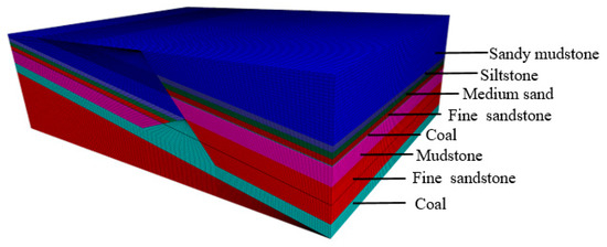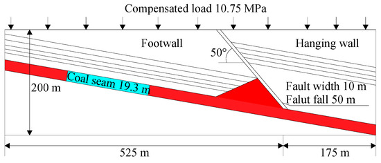 The model contains 449,280 elements and has a size of 700 m × 500 m × 200 m (see Figure 6). In the construction process of the model, the dip angle of the Jurassic roof strata in the footwall of the F16 fault is set to 10°, with the dip angle of the Triassic strata in the upper fault set to 50°. The extremely thick seam zone is simplified into a triangular area with a length of 150 m and a height of 60 m. In the model, a built-in interface module of FLAC 3D is used to simulate the F16 fault structure. The fault inclination is set to 50°, with the starting coordinates of the lower end of the fault plane set to (520, 0, 50). The physical and mechanical parameters were measured using laboratory tests for simulations, as shown in Table 1. The mechanical properties of the fault are shown in Table 2. The boundary conditions of the model are set as follows: normal displacement constraints are applied around the model, the bottom boundary is set to a fixed boundary, the displacement in the X, Y, and Z directions is zero, and the upper boundary is set as a free boundary (see Figure 7). A uniform load of 10.75 MPa is utilized to simulate the overlying rock pressure, with a height of 430 m. In order to simplify the spatial relationship between the 13,200 working face and the F16 fault in the simulation process, the F16 fault in the model is fixed, and the excavation step is 20 m along the coal seam inclination. Moreover, the excavation is stopped near the fault in the lower roadway due to frequent microseismic events. The influence of mining disturbance, seam thickness, fault dip angle, and other factors on the structural stress of the coal seam is studied.