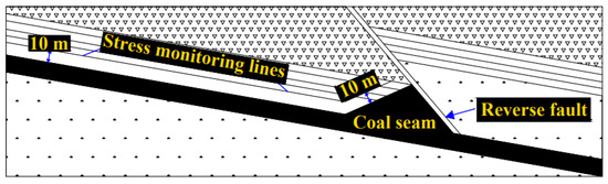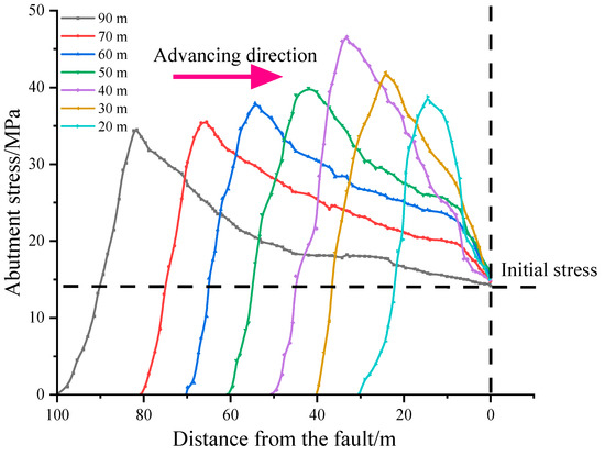 In order to obtain the stress distribution law of surrounding rock at different positions in front of the coal wall during coal mining, the working face is inclined along the coal seam, and the length of each excavation is set to 10 m. The monitoring line is set at the 10 m position of the roof, with monitoring points spaced at 10 m intervals (see Figure 7). The stress distribution curves of the surrounding rock are obtained at different positions in front of the coal wall, as shown in Figure 8. The excavation positions are 100 m, 80 m, 70 m, 60 m, 50 m, 40 m, 30 m, and 10 m away from the fault.