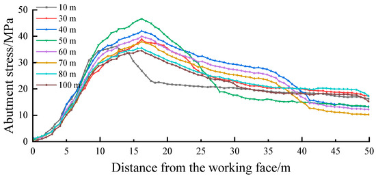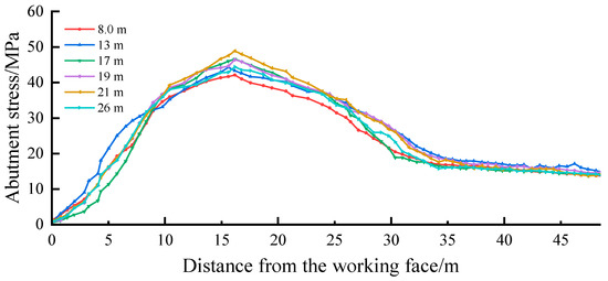 The following stress distribution law for different mining thicknesses can be obtained from Figure 15, Figure 16 and Figure 17.