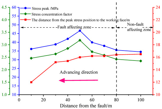 - With the increase in mining distance, both stress peak and stress concentration coefficient values first increase and then decrease (see Figure 10 and Figure 11), with maximum values of 46.62 MPa and 3.17, respectively, located 50 m away from the working face. When the distances from the fault are 100 m and 80 m, the peak stress values are 34.51 MPa and 35.52 MPa, respectively. The distribution law of the advanced supporting pressure of the working face is similar. When the distance is less than 80 m, the stress peak value increases significantly. With the advancement of the working face toward the fault direction, the influence of the fault on the working face becomes increasingly obvious. The stress reaches its maximum value at a distance of 50 m from the fault, and at a distance of 80 m from the fault, it is divided into a fault-affected zone and a fault non-affected zone. When the distance from the fault is less than 50 m, the increasing trend of the stress peak and stress concentration coefficient decreases. When the working face is excavated 10 m away from the fault, the stress on the coal far exceeds the compressive strength because of the small distance between the fault and the working face. Consequently, coal failure occurs, and the peak stress is reduced by 36.14 MPa. The fault reduces the supporting stress range and forms a large stress gradient between the coal wall and the fault, which results in a rock burst.