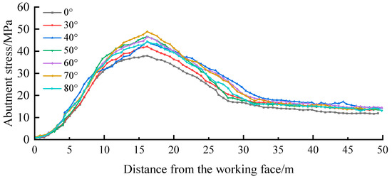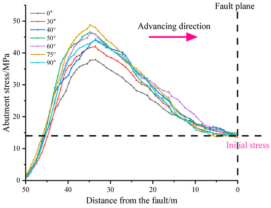 Abutment stress in front of the working face for different fault dip angles.