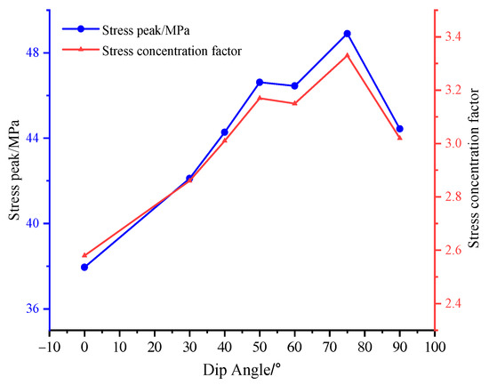 The following stress distribution law for different dip angles can be obtained from Figure 12, Figure 13 and Figure 14.