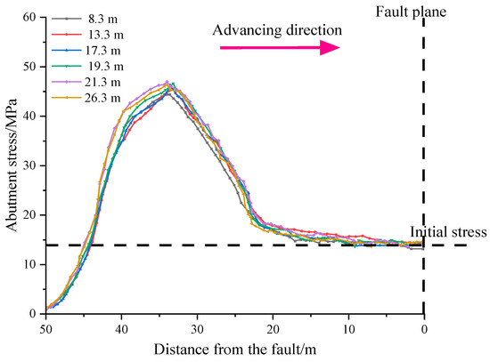 Abutment stress at different distances away from the fault plane.
