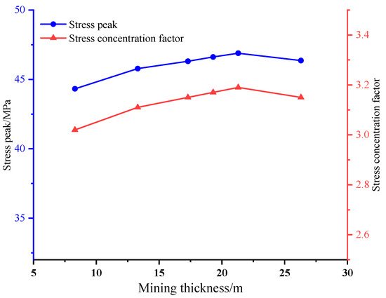 Stress peak and stress concentration factor from the fault for different mining thicknesses.