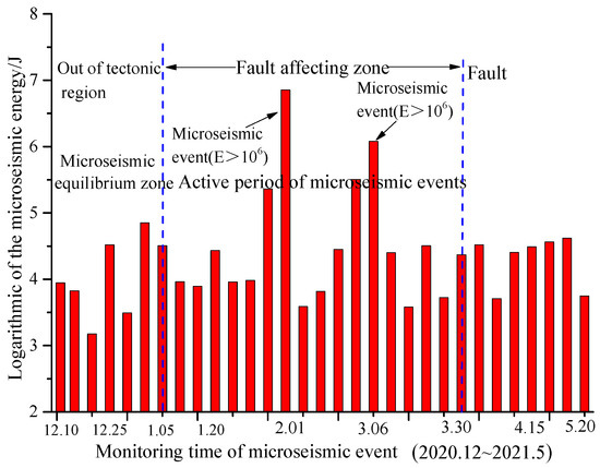 Microseismic events in front of the “fault” tectonic area were counted to further verify the mechanisms of rock burst for extra-thick coal influenced by a large conglomerate and a thrust fault. Microseismic events are defined as high-energy events when E > 106 J; conversely, microseismic events are defined as low-energy events when E ≤ 106 J.
