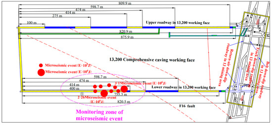 - The 13,200 working face of the Gengcun coal mine is used as a case study, and field microseismic events are analyzed. The field microseismic events mainly occur at a distance of 0–80 m from the footwall of the fault, with the energy and frequency of microseismic events reaching their maximums at a distance of 30–50 m from the footwall. This is in good agreement with the simulated results of the stress concentration area. When the working face is located in the influence zone of the tectonic area, microseismic events occur more frequently and with greater energy.